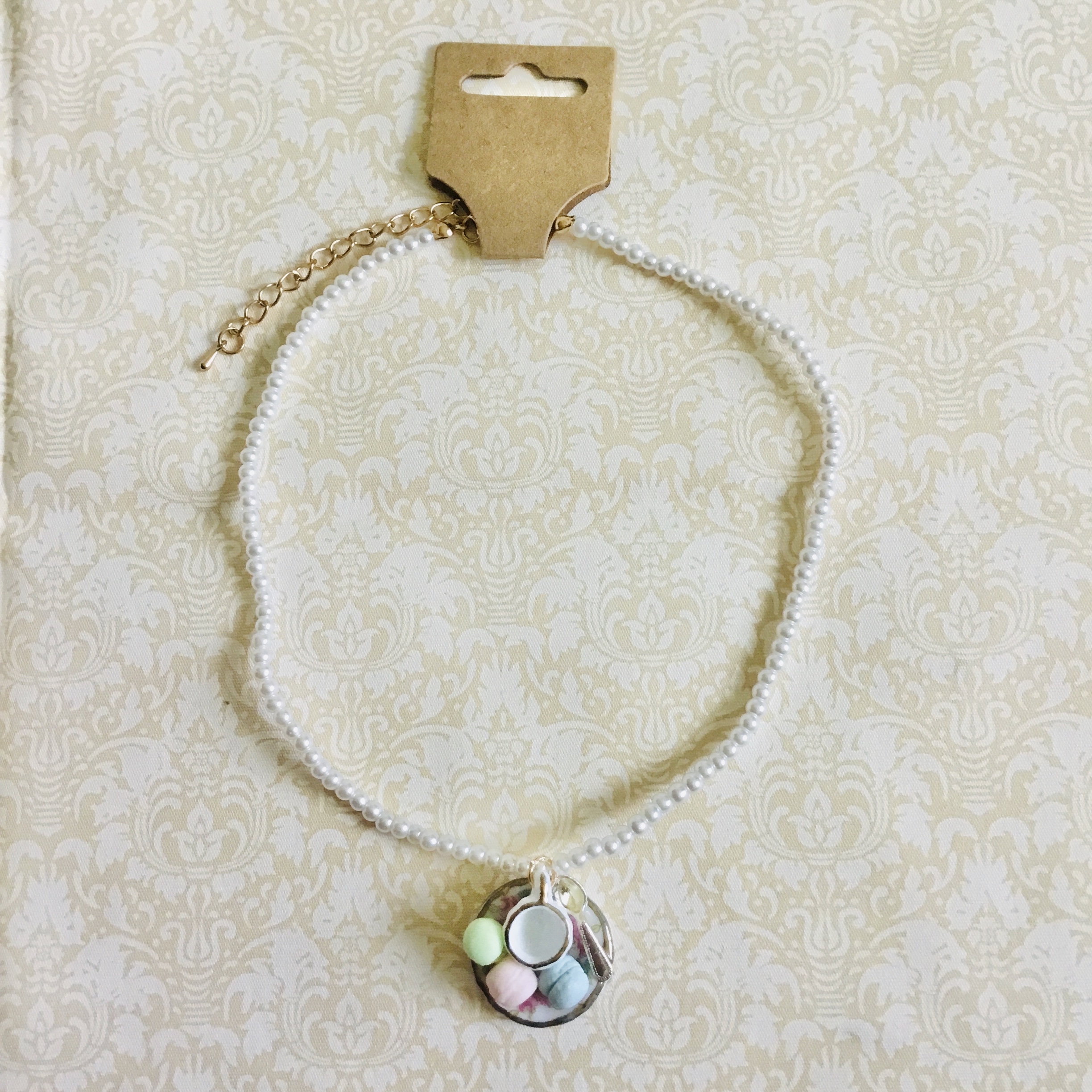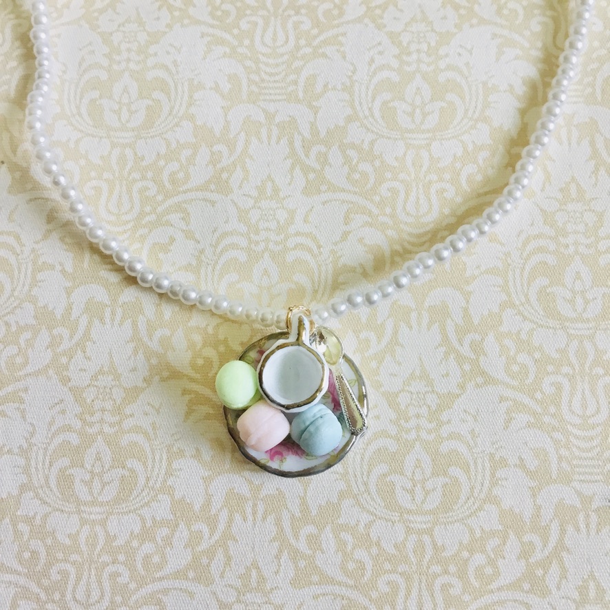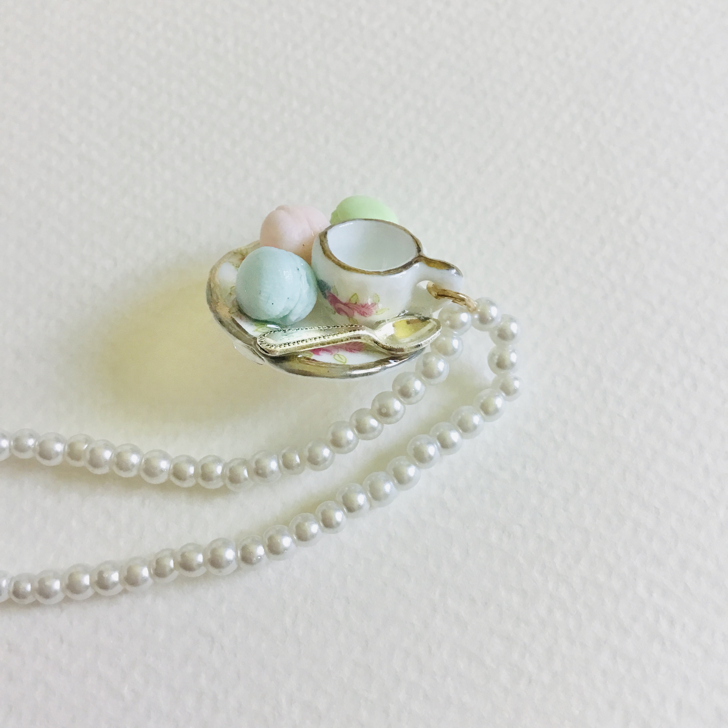 Take Tea Time everywhere with a dainty selection of macarons and a teacup around your neck.